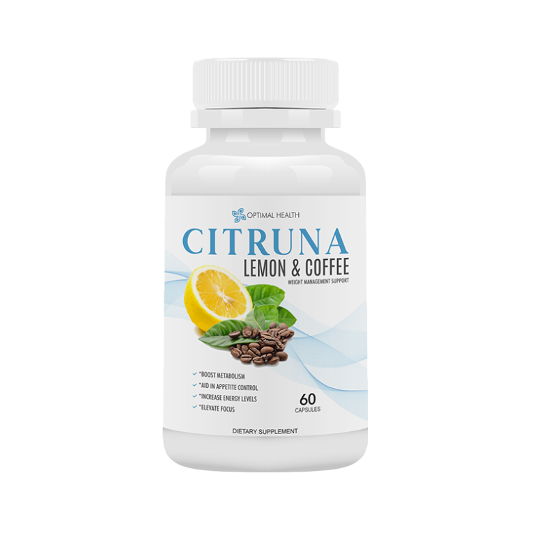 Citruna Lemon and Coffee by Optimal Health combines lemon-based compounds with coffee extracts, including Green Coffee Bean Extract and Arabica Bean Extract, along with added minerals. The product is manufactured in GMP-certified US facilities and offers a 60-day money-back guarantee.
